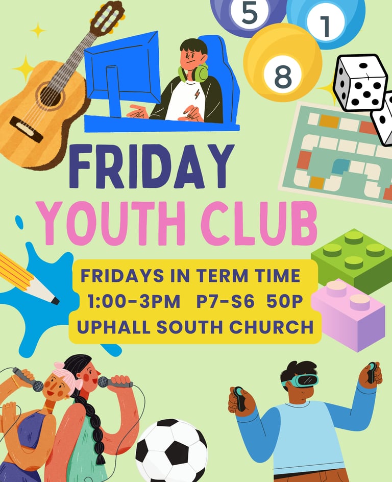 Our Friday Youth Club meets every Friday after school at Uphall South Church. P7-S6 pupils are welcome to join us for an afternoon of fun, friendship, and community.